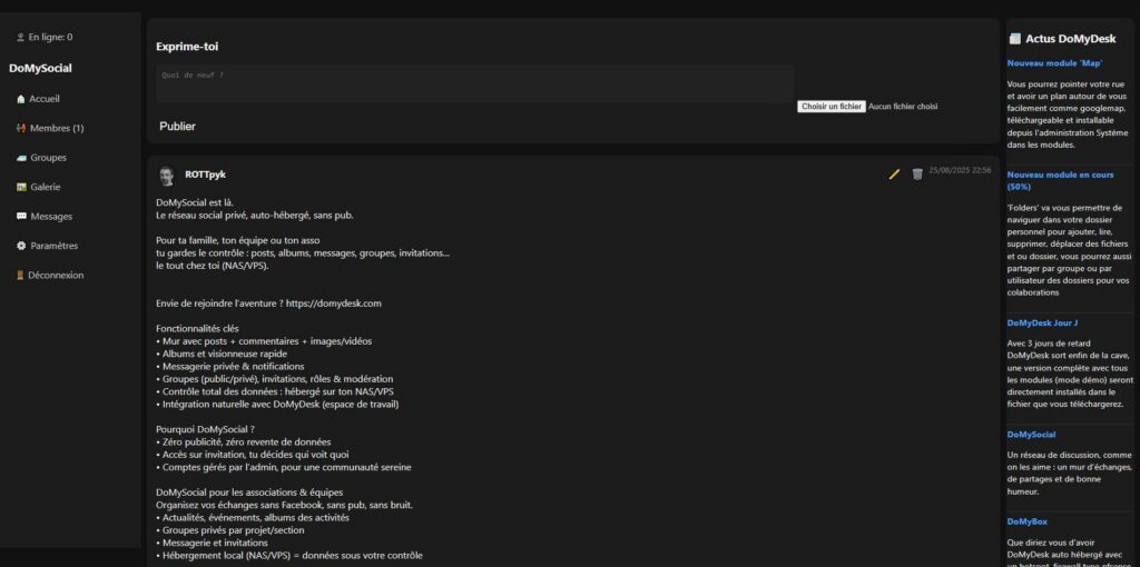 - L’usage : Il permet de créer un « mur » d’échanges, de partager des fichiers et de discuter en toute sécurité. C’est l’outil idéal pour une famille, une petite entreprise ou une association qui veut communiquer sans passer par les GAFAM.